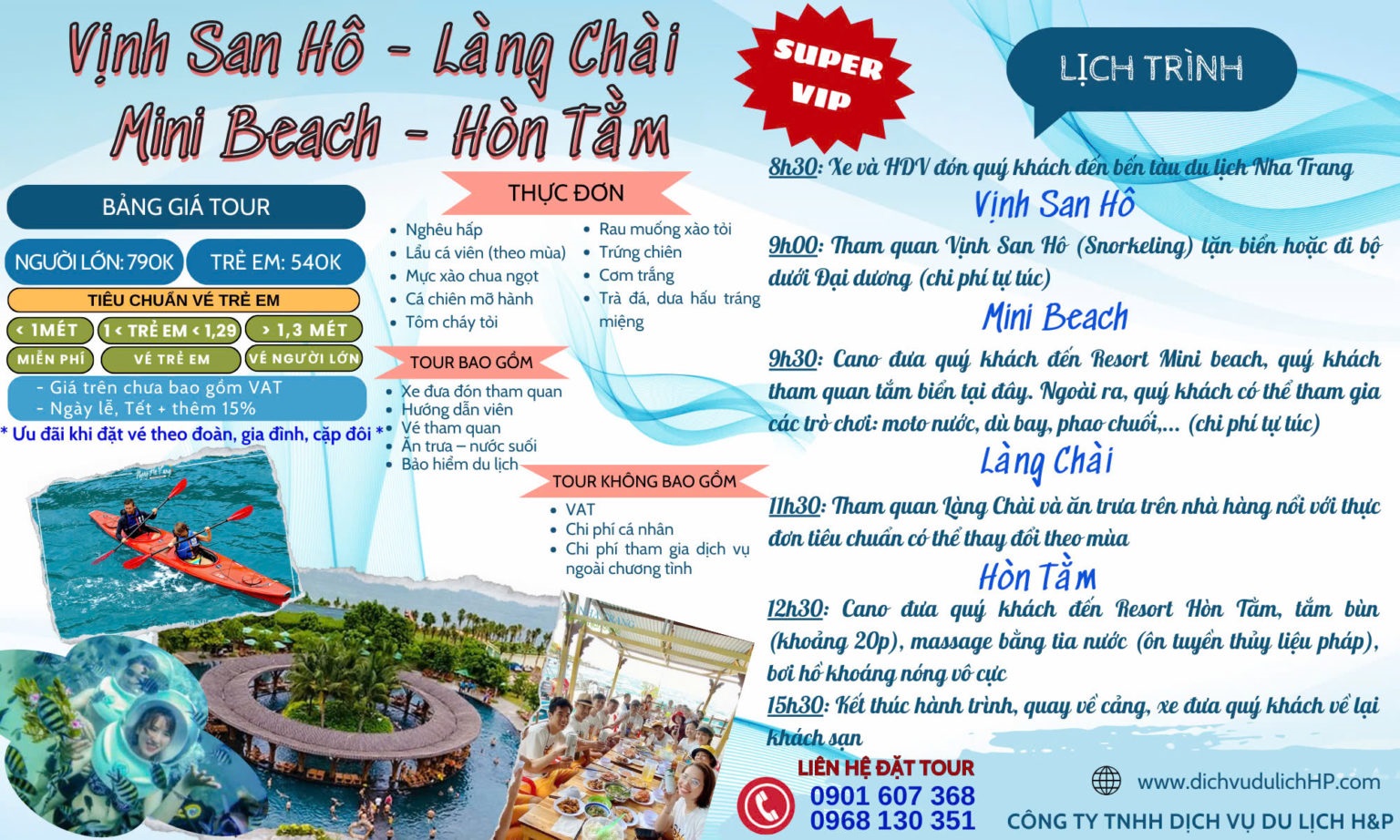Tour 4 Đảo Vịnh San Hô – Làng Chài – Mini Beach – Hòn Tằm là một trong những địa điểm du lịch hấp dẫn tại Nha Trang, với vẻ đẹp hoang sơ của hòn tự nhiên kết hợp hài hòa với sự cầu kỳ, tinh tế của kiến trúc hiện đại làm nơi đây được xem là một trong những địa điểm không thể bỏ qua khi đi du lịch đảo Nha Trang. Đảo này nổi tiếng với cảnh quan thiên nhiên tuyệt đẹp, bãi biển trong xanh và cát trắng mịn màng, thu hút nhiều du khách đến tham quan và nghỉ dưỡng, đặc biệt là sự cuốn hút đến mê người của Vịnh San Hô và Đảo Hòn Tằm.