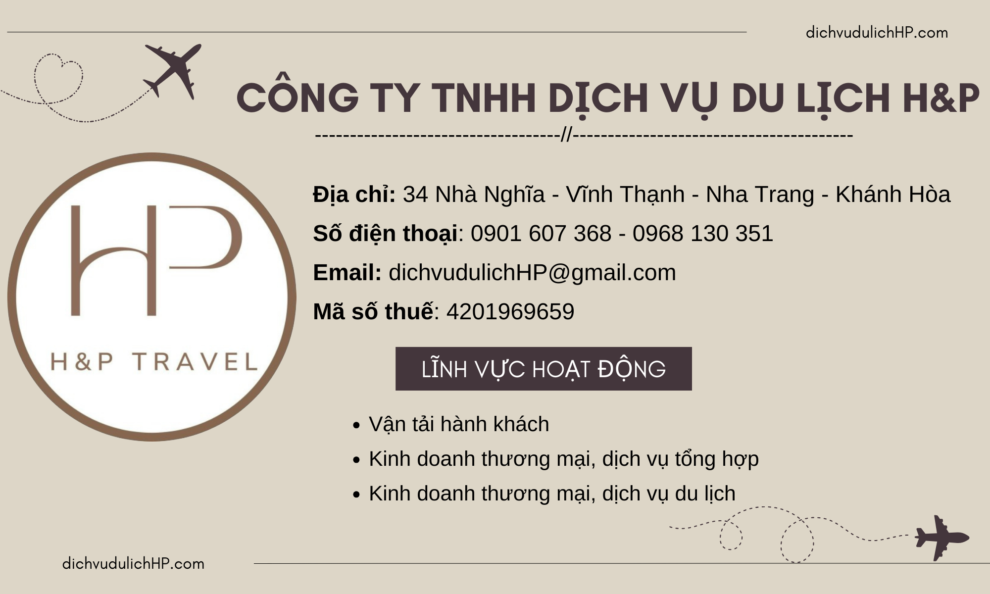 Công ty TNHH Dịch vụ Du lịch H&P - Phòng Giao Dịch: Lô 15 đường 6B-6C KĐT Lê Hồng Phong 2, Tp Nha Trang, Tỉnh Khánh Hoà.