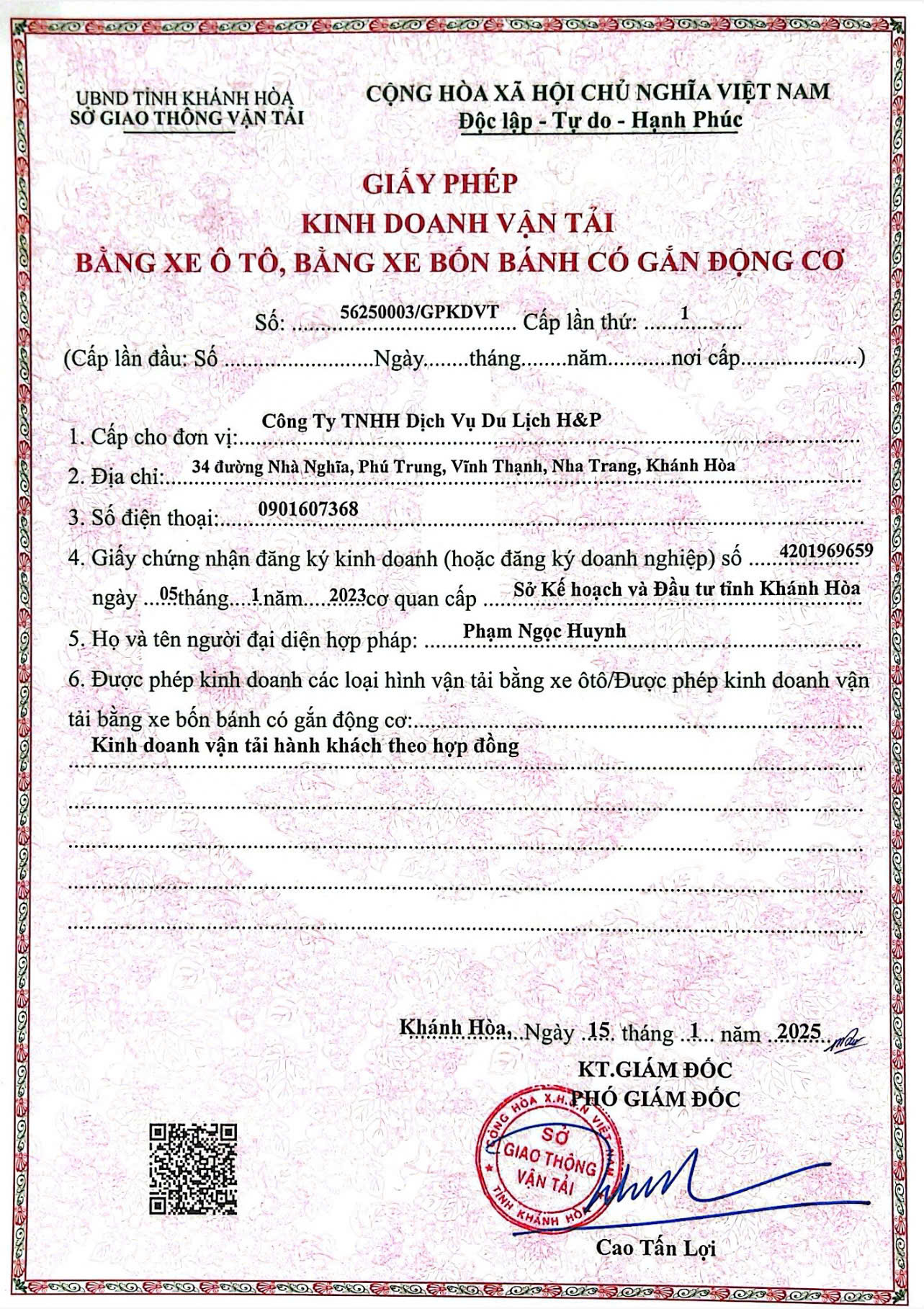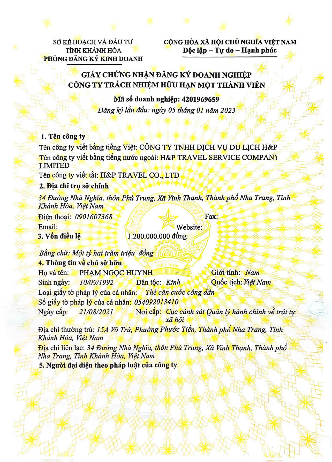 Công ty TNHH Dịch vụ Du lịch H&P - Phòng Giao Dịch: Lô 15 đường 6B-6C KĐT Lê Hồng Phong 2, Tp Nha Trang, Tỉnh Khánh Hoà.